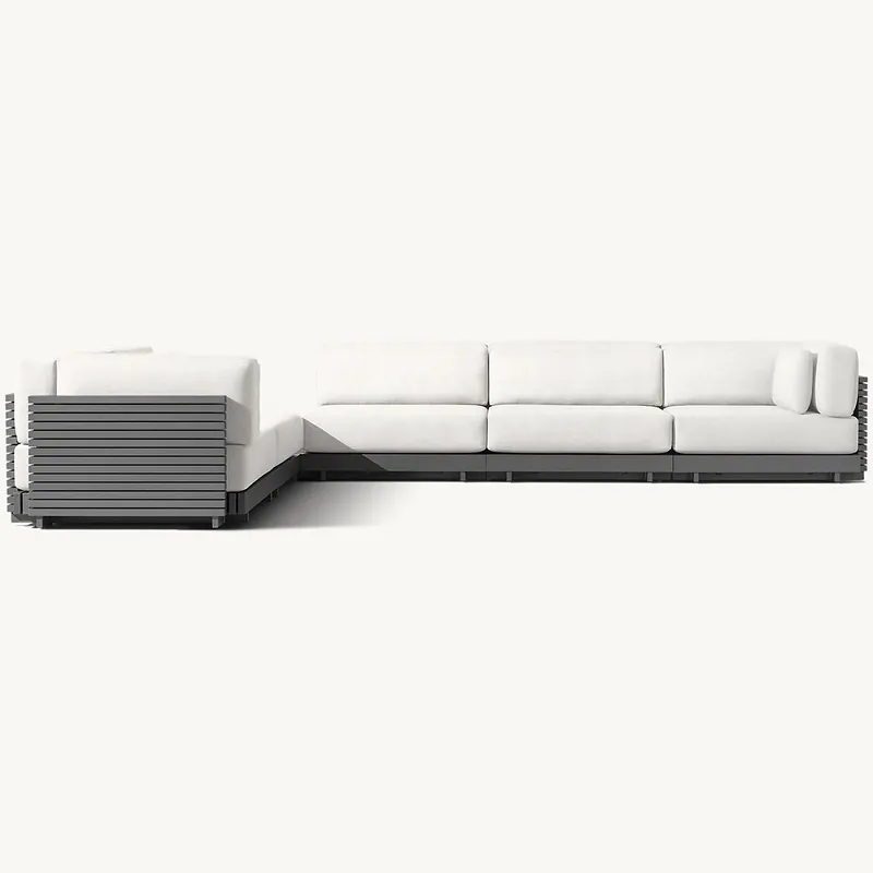 โซฟากลางแจ้งรูปตัวแอลได้รับการออกแบบมาไม่เพียงแต่เพื่อสไตล์ แต่ยังเพื่อความสบายอีกด้วย รูปทรงตัวแอลตามหลักสรีรศาสตร์ให้พื้นที่กว้างขวางสำหรับการพักผ่อนและทำให้เป็นจุดศูนย์กลางสำหรับการสังสรรค์ทางสังคม โดยเป็นทั้งมุมพักผ่อนแสนสบายและพื้นที่นั่งกว้างขวางสำหรับแขก เบาะนุ่มสบายทุกสภาพอากาศที่มากับโซฟาทั้งนุ่มสบายและทนทาน ทำจากวัสดุที่ทนต่อการซีดจางและความเสียหายจากความชื้น ช่วยให้คงความสดใสและรองรับได้ดีในระยะยาว